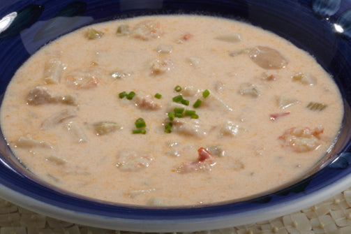 This hearty cream-based stew brings the flavors of the North Atlantic to your table! This Seafood Chowder features Clams, Haddock, Pollock, Lobster and Shrimp.